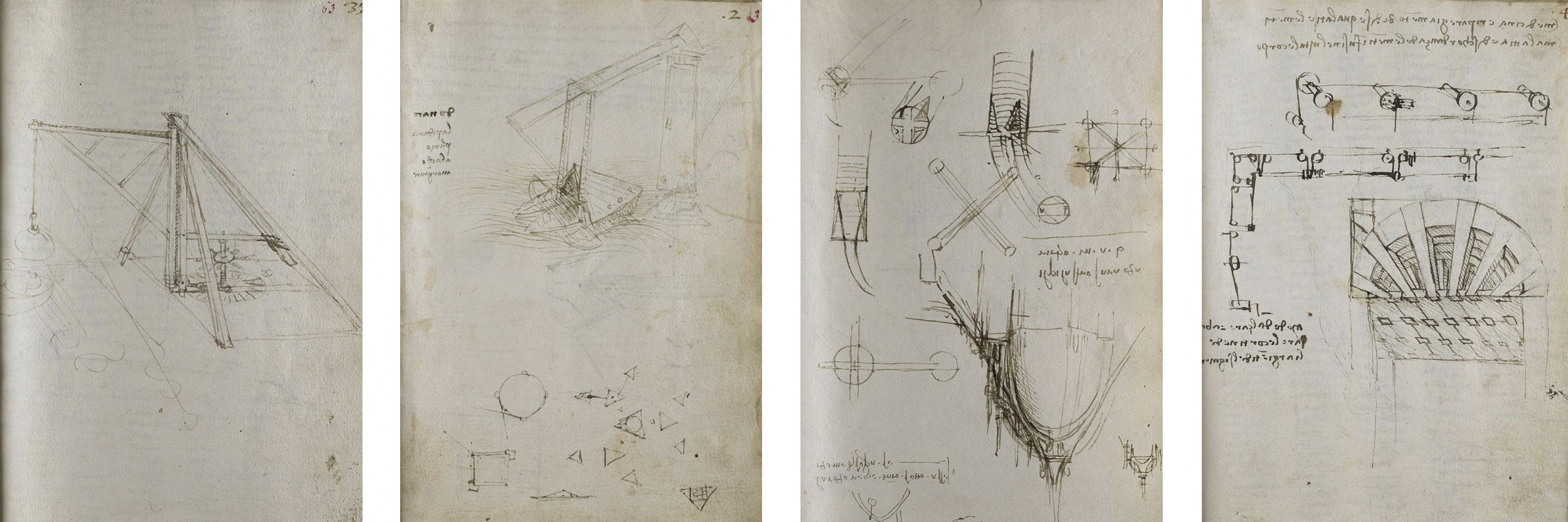 - Technical Diagrams : The technical diagrams detail the internal mechanisms of these machines, highlighting Leonardo's ability to combine theory and practice in his designs.