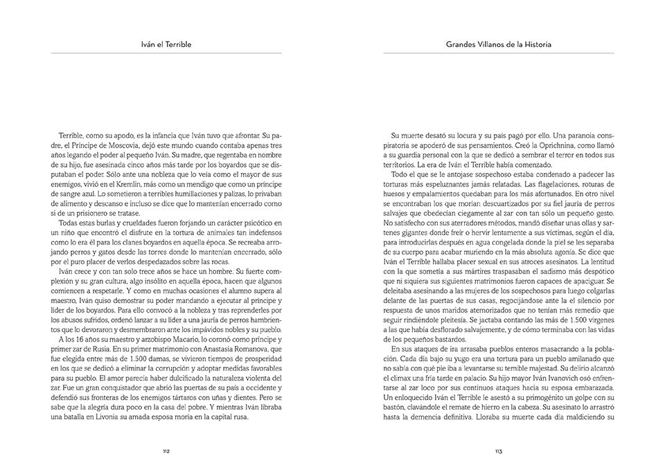 This is a work that delves into the most wretched of human capacities when it comes to meanness. A journey into the shadows of the Villains of History, who left behind a dark and sordid legacy that has become part of human history. Tyrants, villains, and unscrupulous despots are featured in this work, accompanied by illustrations by Marta Zapata that put a face to evil and, in each article, seek to penetrate the depths of minds so twisted that they were capable of shaking the world to this day.