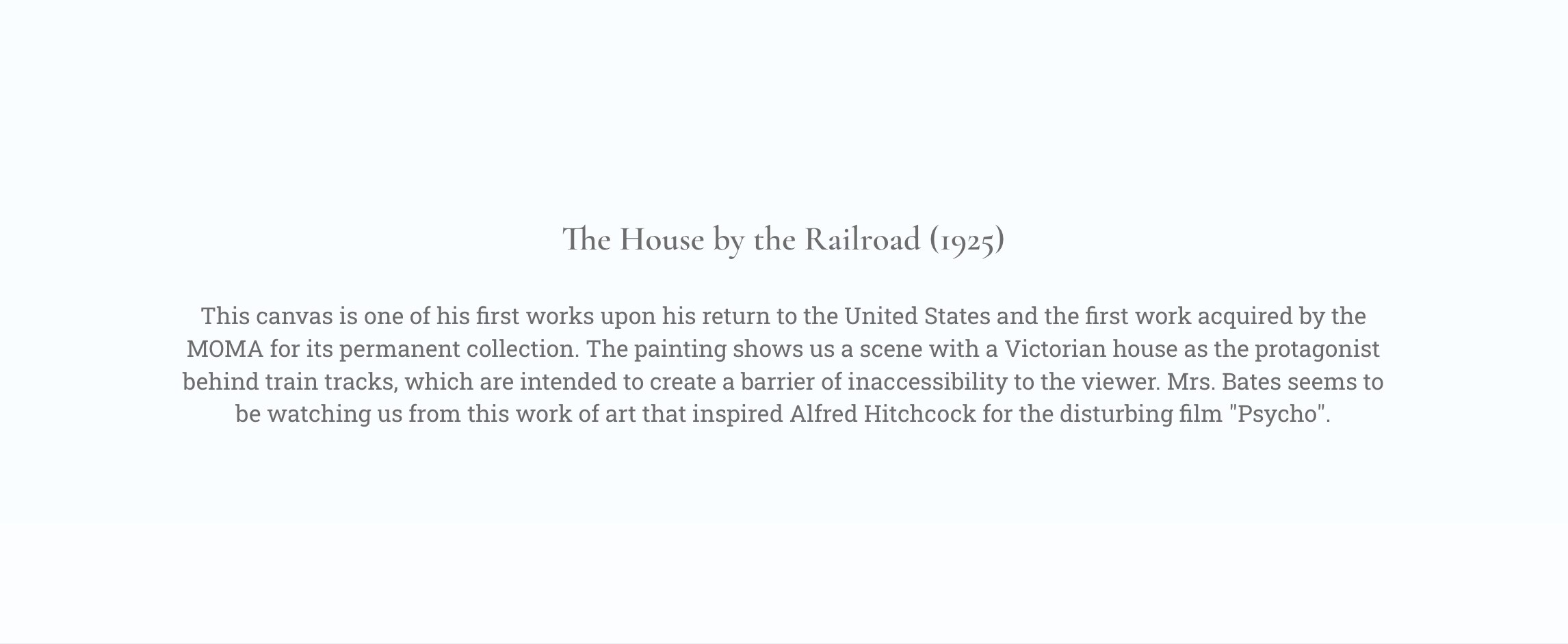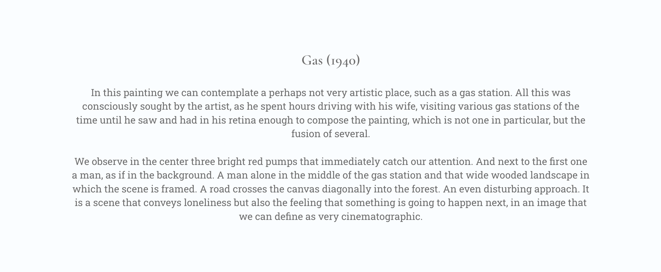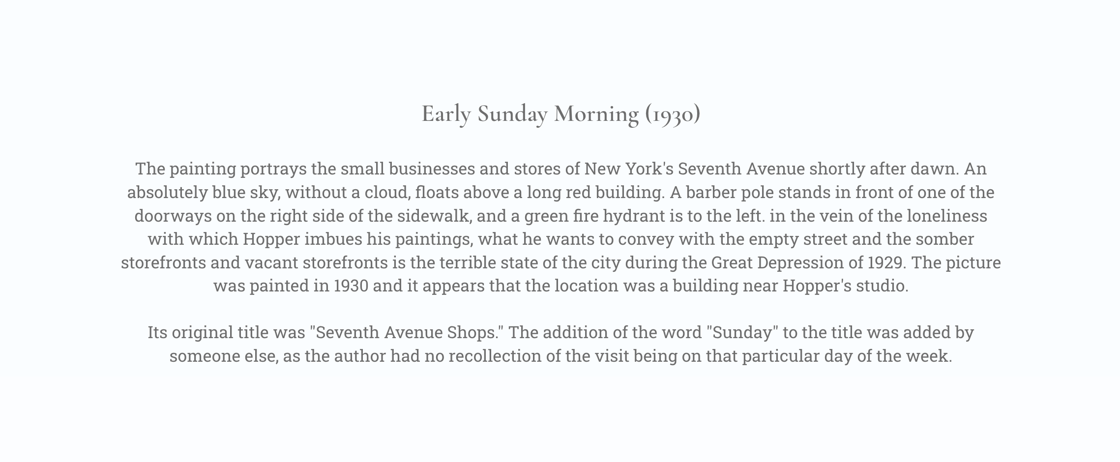 Hopper abandonó la nostalgia del viejo continente para instalarse en Estados Unidos, donde comenzó a captar ambientes urbanos siempre con su característico halo de soledad. La melancolía también le acompañó en sus lienzos de paisajes en los que favoreció el mar y los acantilados como telón de fondo.