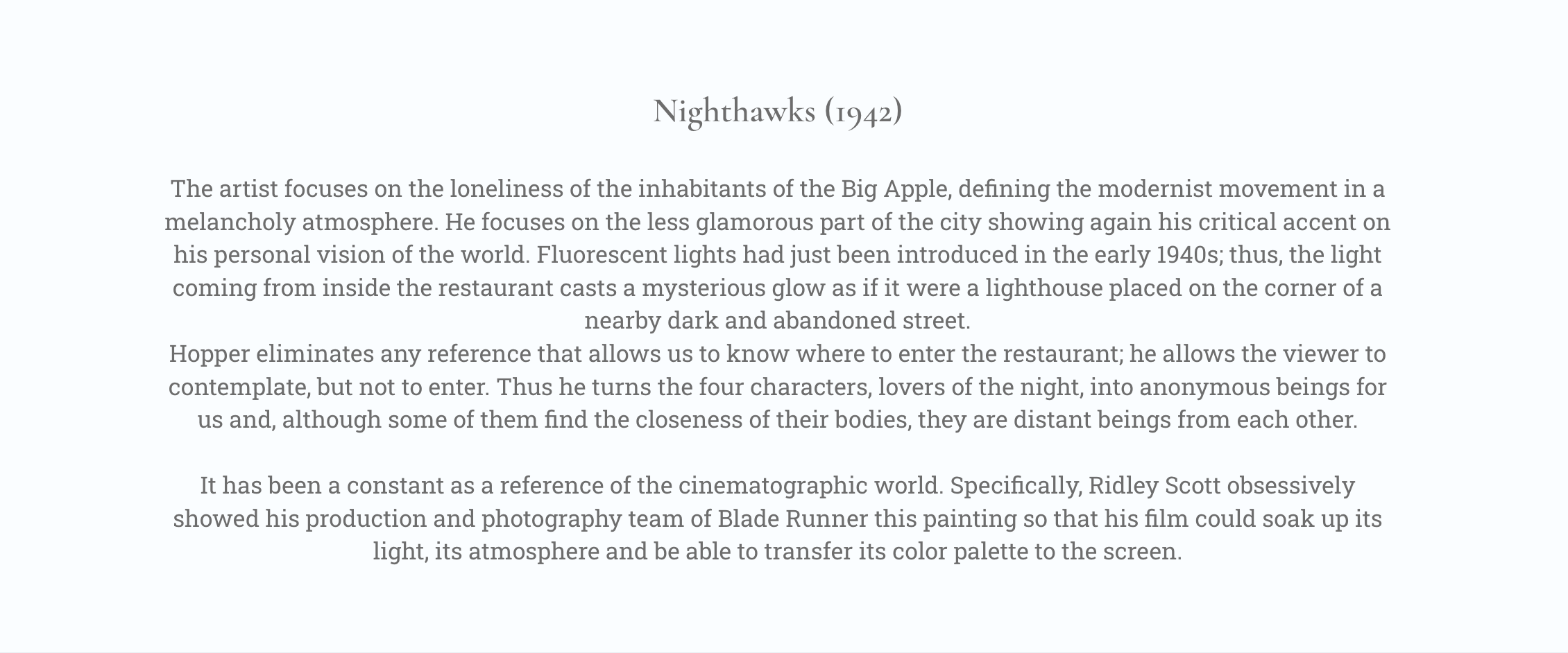 Fue capaz de dar color a la soledad y pintar el silencio. Hopper era un hombre de pocas palabras. Hablaba poco pero observaba mucho. Esta era la base de su filosofía, como dijo una vez: “El gran arte es la expresión externa de una vida interior en el artista y esta vida interior producirá su visión personal del mundo. El elemento esencial es la imaginación y no hay ningún nivel de invención artificial que pueda sustituirla”.