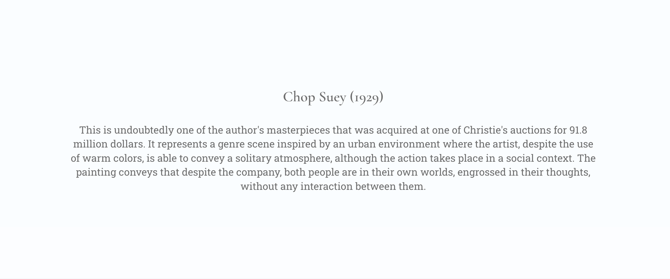 En este volumen, una edición limitada mundial con una tirada de 999 obras, The Galobart le invita a descubrir once de sus obras más emblemáticas impresas en láminas de arte de colección. La colección incluye Chop Suey, una de sus piezas conocidas por alcanzar un nuevo récord durante una subasta celebrada en Nueva York: 91,8 millones de dólares fue el precio final, superando con creces su anterior obra más valiosa, East Wind Over Weehawken, vendida por 40,5 millones de dólares en 2013, y las icónicas Nighthawks, Gas y Ground Swell de Hopper, además de otras seis maravillas pictóricas.